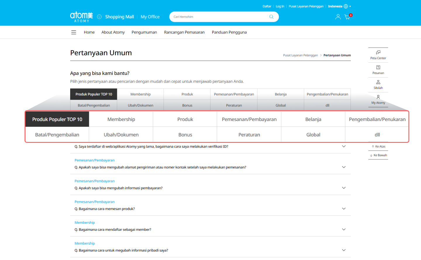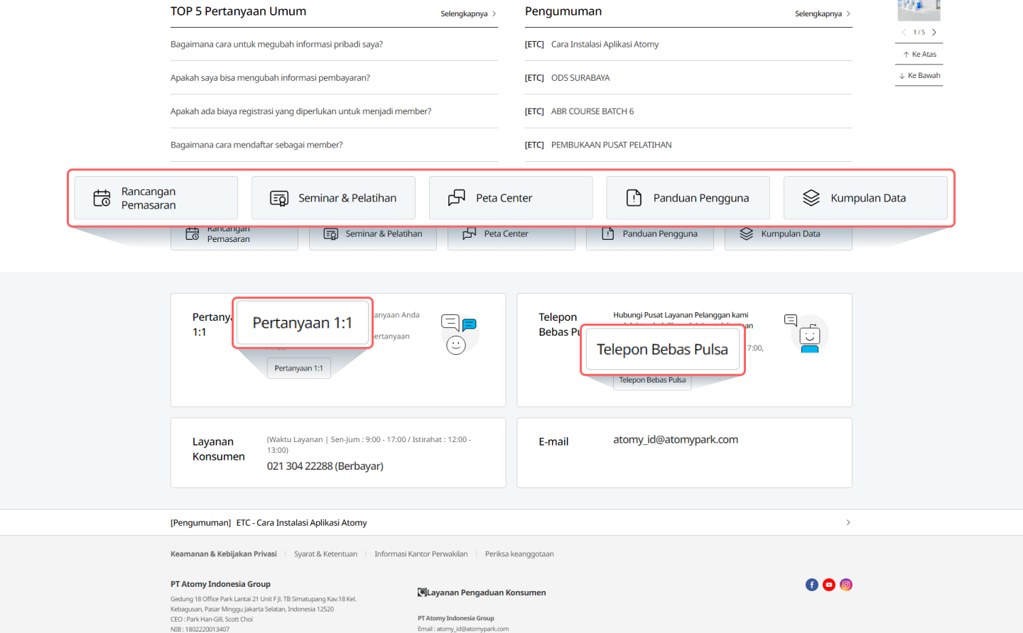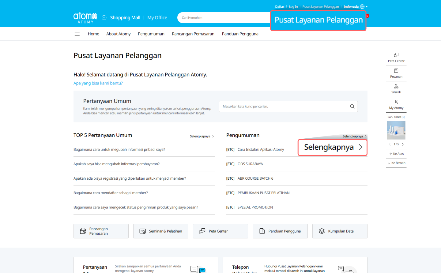 Klik ‘Pusat Layanan Pelanggan' di pojok kanan atas. Di sana Anda dapat menemukan FAQ, Pengumuman, Rancangan Pemasaran, dan Informasi Seminar. -