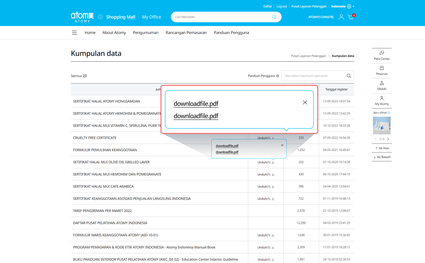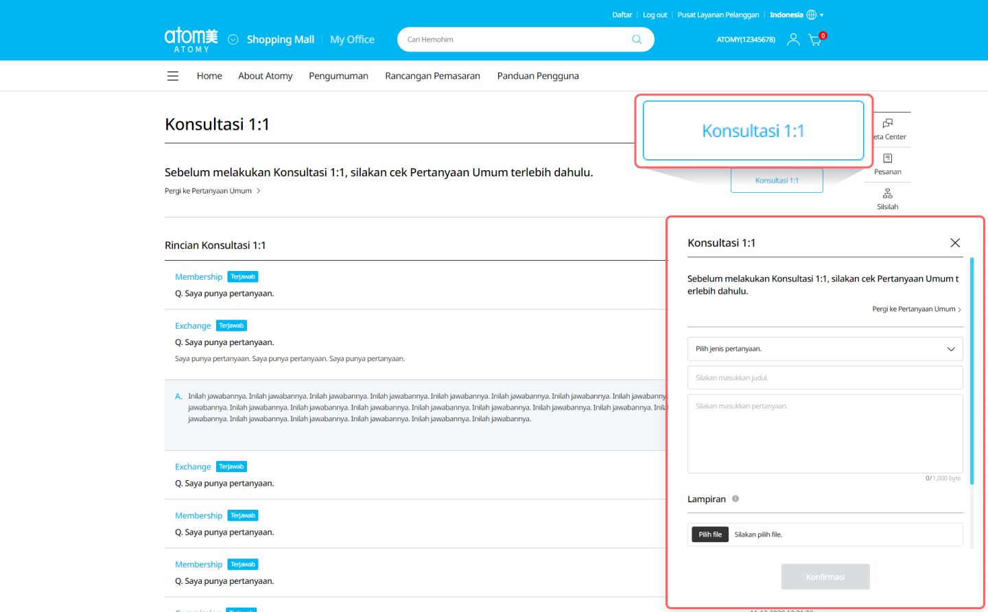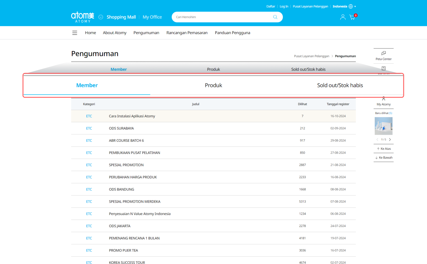 Klik ‘Pusat Layanan Pelanggan' di pojok kanan atas. Di sana Anda dapat menemukan FAQ, Pengumuman, Rancangan Pemasaran, dan Informasi Seminar. -